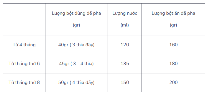 Mỗi bé có những đặc trưng riêng vì vậy lượng bột mỗi bé sẽ khác nhau. Mẹ có thể tham khảo bảng lượng pha bột ăn dặm Hipp khởi đầu dưới đây: