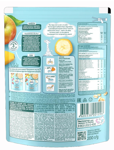 Thành phần: Sữa bột nguyên kem (38%), bột yến mạch (31%), đường, chuối nghiền (10%), prebiotic-inulin, táo nghiền (3%), các vitamin (C, E, PP, Axit pantothenic, B2, B1, B6, A, axit folic, D3, biotin, B12), các khoáng chất (sắt, kẽm, i-ốt).