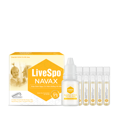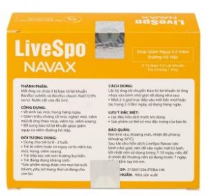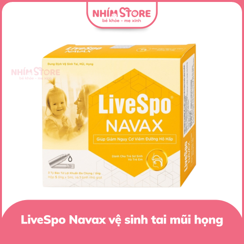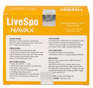 Livespo Navax chứa 3 tỷ bào tử lợi khuẩn/ống, giúp giảm nguy cơ viêm đường hô hấp; giảm các triệu chứng sổ mũi, nghẹt mũi, viêm mũi dị ứng theo mùa, viêm tai, viêm xoang; dùng vệ sinh tai, mũi, họng hàng ngày.