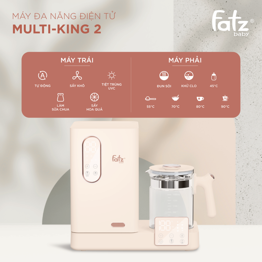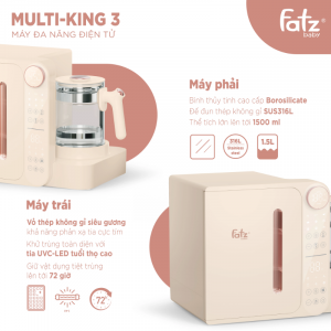Dòng máy Multi-king được yêu thích bởi sự đa năng giúp mẹ tiết kiệm không gian và chi phí. Máy đa năng điện tử Multi-king 3 với thiết kế thông minh, kiểu dáng sang trọng được tích hợp tới 11 chế độ hoạt động. Bên trái là máy tiệt trùng, sấy khô và bảo quản UVC-LEDs. Bên phải là bình đun và hâm nước pha sữa điện tử. Multi-king 3 sở hữu nhiều tính năng ưu việt nhưng lại có mức giá vô cùng cạnh tranh so với các dòng máy khác trên thị trường.