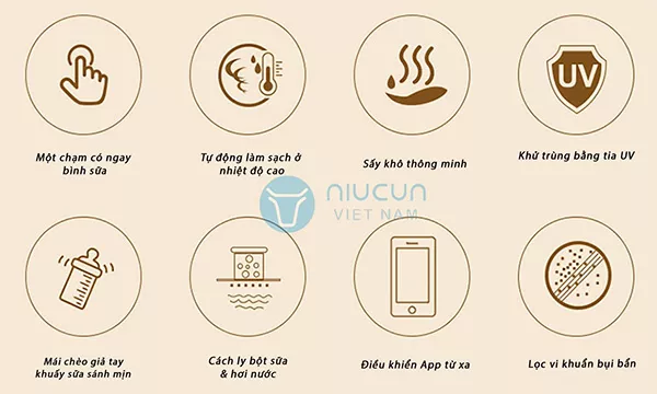 – Ngay cả khi không sử dụng, máy pha sữa Niucun sẽ tự động tự động tiệt trùng sau mỗi 2 giờ để đảm bảo an toàn cho không gian pha sữa cho những lần tiếp theo.